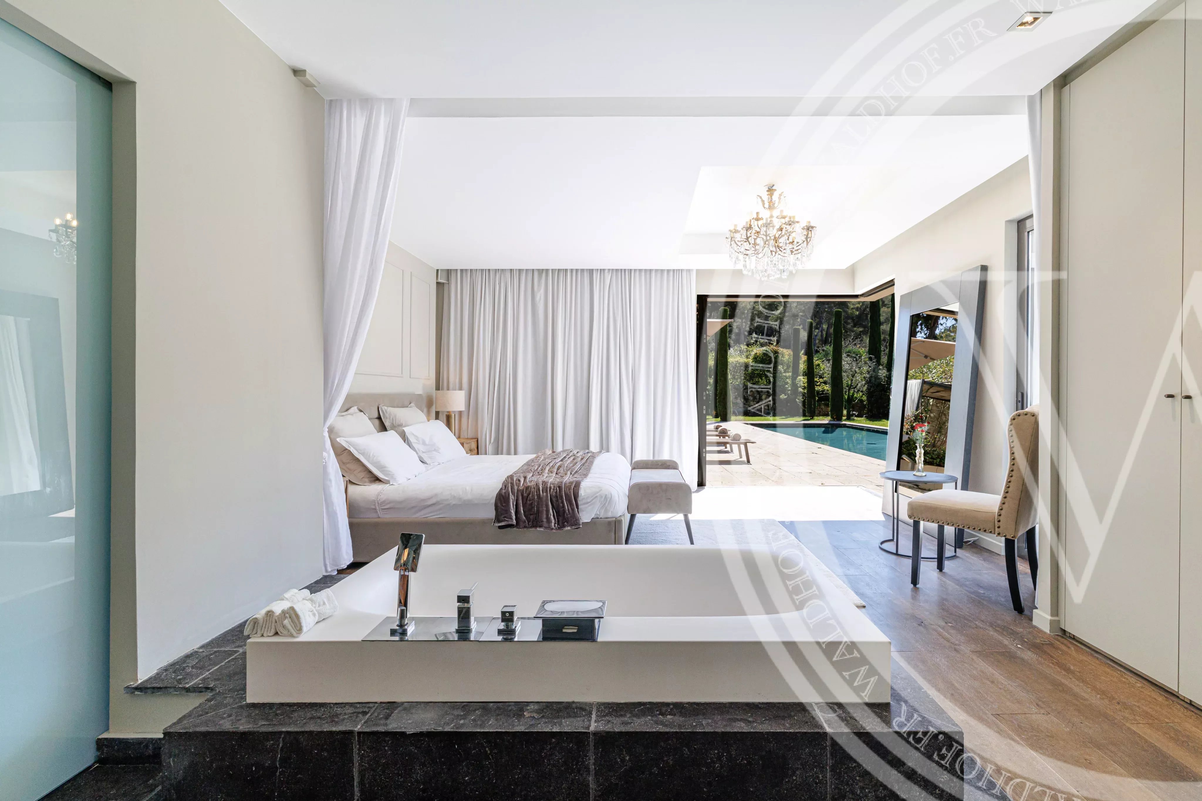 Chambre 1 (Master): 1 lit king size, salle de bain avec baignoire, douche et wc.