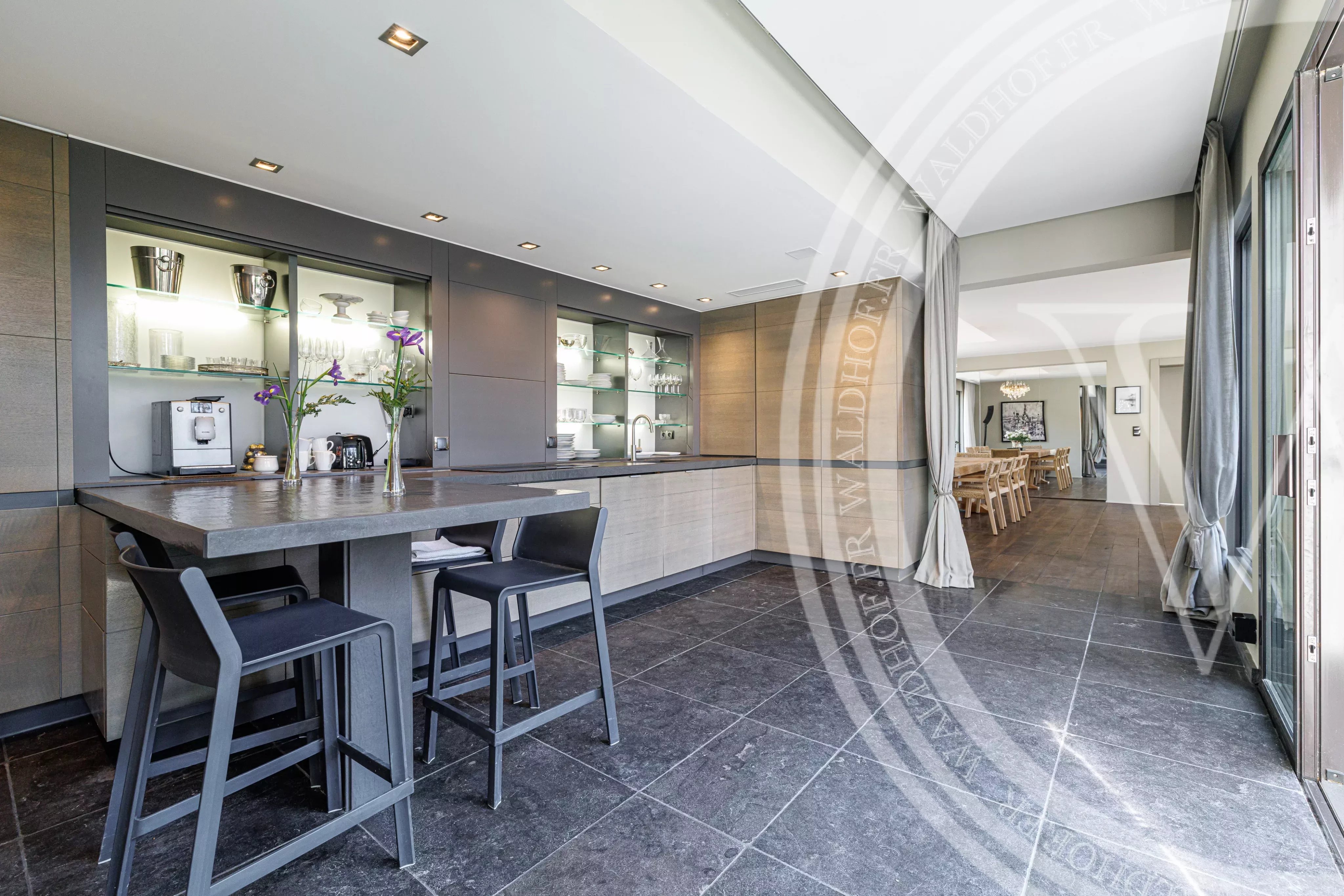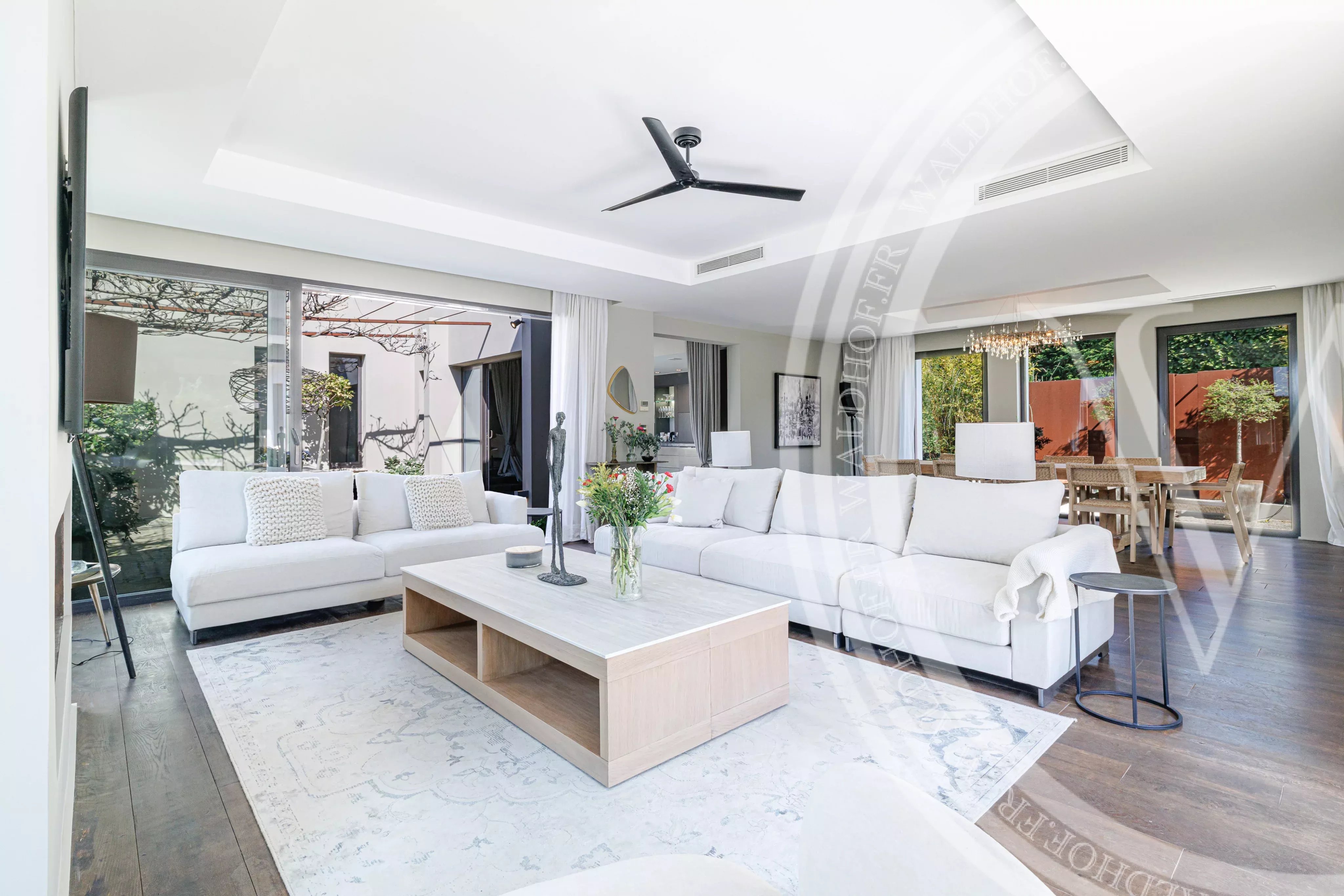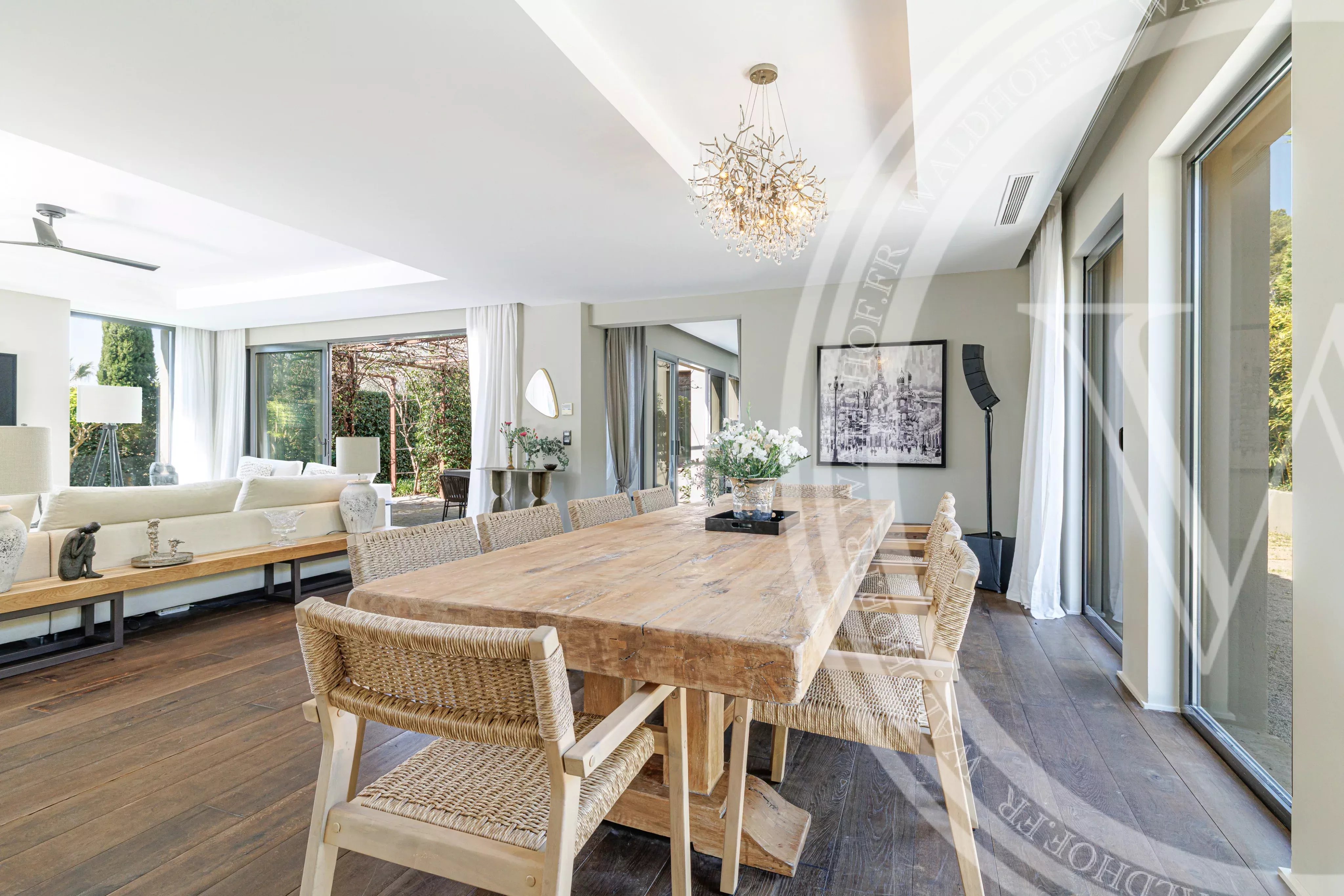 Vaste salon, grande table de salle a manger, cuisine ouverte, accès terrasse.